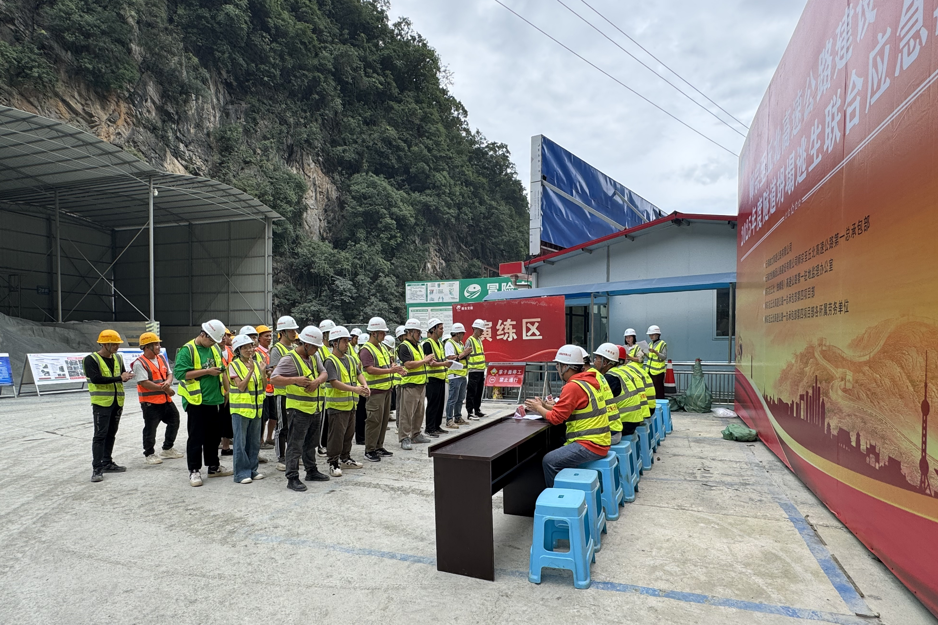 演练模拟了岩风洞2号隧道进口端左洞初期支护出现的开裂、变形、异响和掉块现象。现场安全员迅速采取行动,立即通知作业人员停止作业,并紧急撤离,随后隧道边墙发生了局部坍塌,撤离过程中一人受伤被困,面对这一紧急情况,项目部在接到险情报告后立即向总包部值班领导汇报,按要求立即启动应急预案,快速集结应急救援小组。