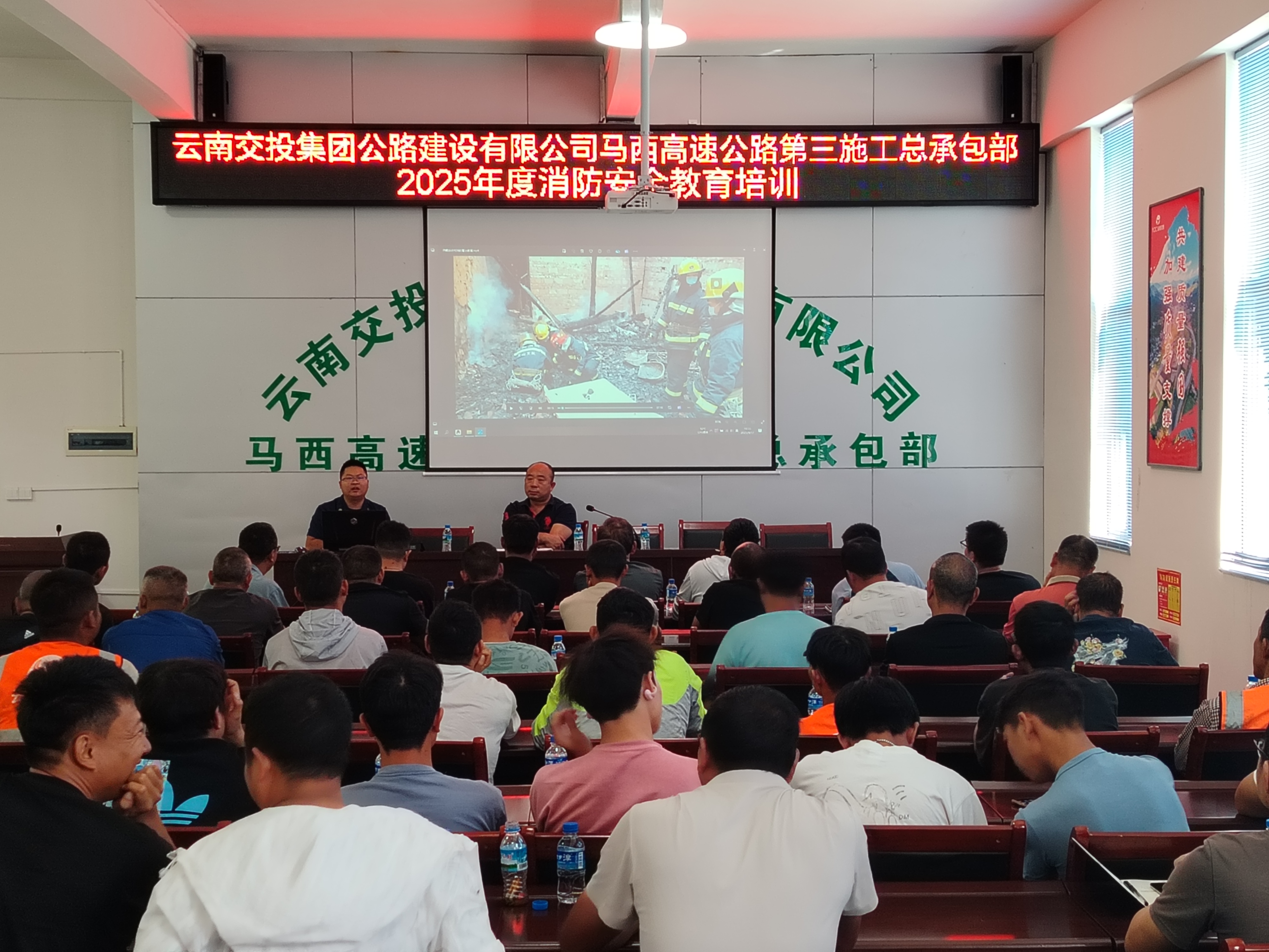 活动邀请东升消防站开展消防安全培训和应急救援实战化演练,针对高速公路施工场地人员密集、用电用火集中、易燃材料多等实际特点,精心设计了理论讲解、火灾警示教育、模拟逃生救援、器材实操4大环节,由西畴县消防大队骨干全程参与指导,确保学习和演练内容贴合项目安全生产需求。活动现场,消防站工作人员详细讲解了《中华人民共和国消防法》相关条款,动火作业范围、级别、流程、危险因素、火灾危害及防火要点等专业知识,并针对施工生产和生活中的用火用电安全防范知识开展知识竞答,现场气氛热烈。